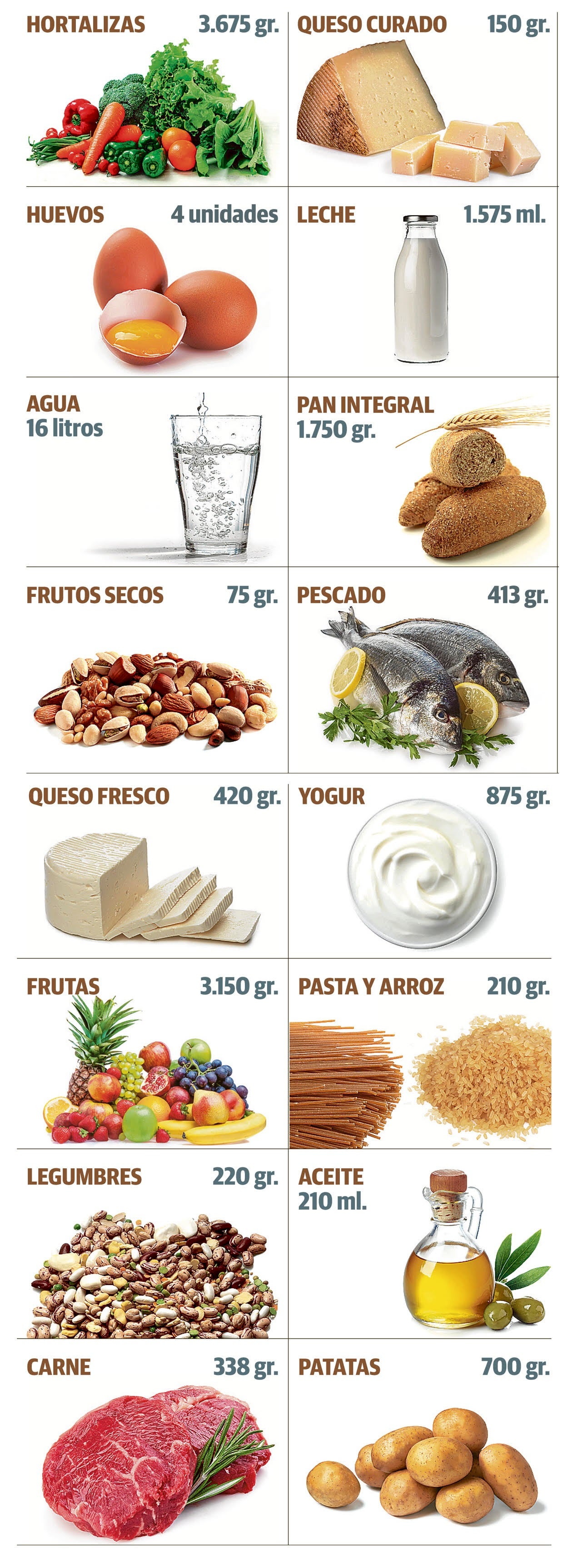 Las recomendaciones de la agencia española son una buena herramienta para elaborar una lista de la compra saludable, ya que nos garantiza incluir las proporciones adecuadas de frutas, hortalizas, legumbres, frutos secos, semillas y cereales integrales –todos los alimentos imprescindibles–. La agencia reclama también potenciar «productos de temporada y de proximidad». Con estas indicaciones, la Organización de Consumidores y Usuarios (OCU) ha elaborado al detalle la dieta que debemos seguir, con el peso en gramos, litros o unidades de cada grupo de alimentos, y cuáles deben ser semanales y diarios. «Nos facilita cubrir nuestras necesidades de nutrientes sin tener que obsesionarnos. Por ejemplo, si comemos las raciones indicadas de hortalizas, ya nos aseguramos cubrir el aporte de fibra, minerales y vitaminas», apunta la OCU.