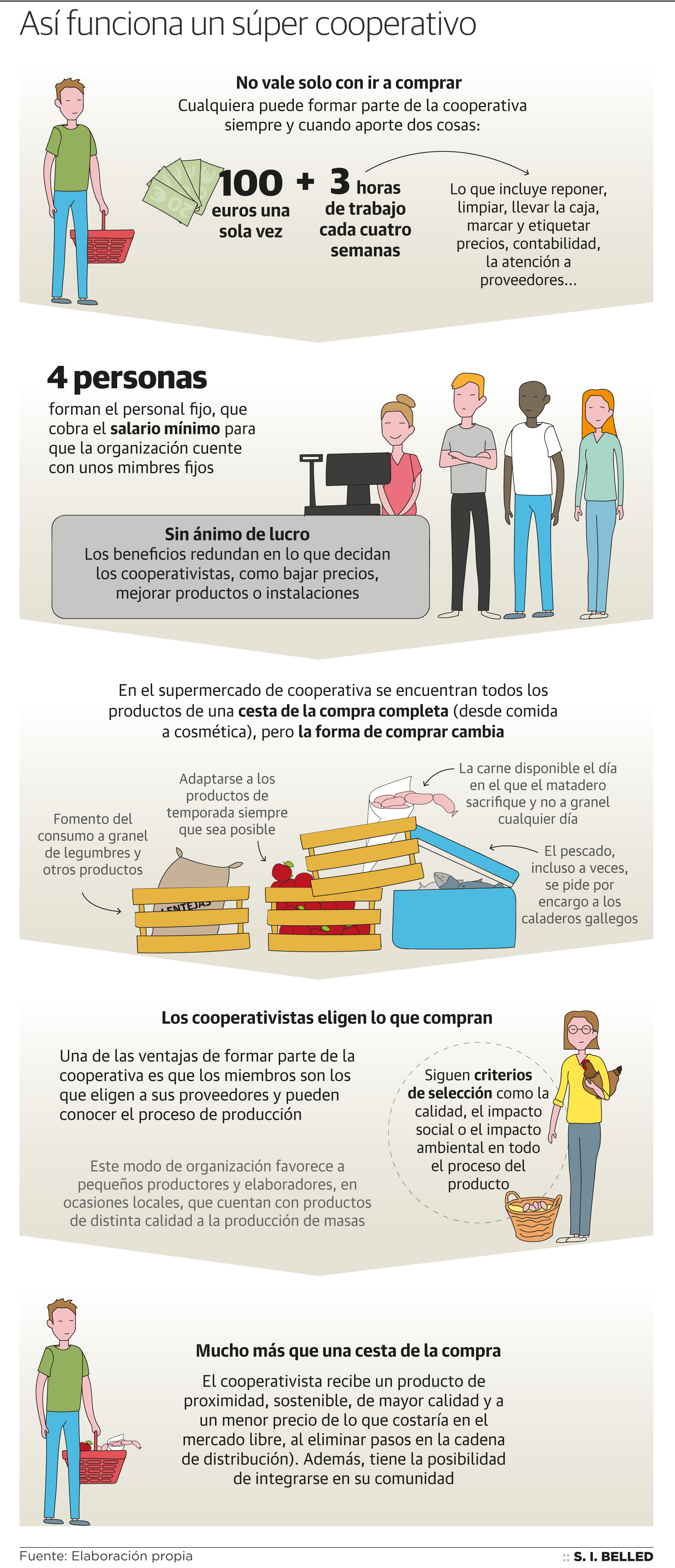 En un cartón de huevos la mayoría no ve más que una docena de ricas posibilidades de recetas. Pero hay gente que ve, y va, más allá. Se preguntan qué comieron las gallinas, las condiciones de su corral o si el granjero cobró lo justo por el producto. Hasta cuestionan la necesidad del anuncio por el que la marca de huevos se ha hecho famosa. Le llaman los consumidores conscientes, aquellos que se declaran preocupados de todos los detalles de la comida que ponen en su mesa. Un colectivo que crece y que acaba de dar el paso para tomar el control absoluto de su cesta de la compra. Para ello se han constituido en supermercados cooperativos donde son dueños, empleados y clientes. En ellos los consumidores son soberanos: toman las decisiones sobre qué se vende, conocen las condiciones de producción, establecen criterios de compra según sus necesidades, saben el por qué de cada precio y no hacen negocio. El ánimo de lucro cede ante el ánimo de alimentarse bien, más barato y en comunidad.