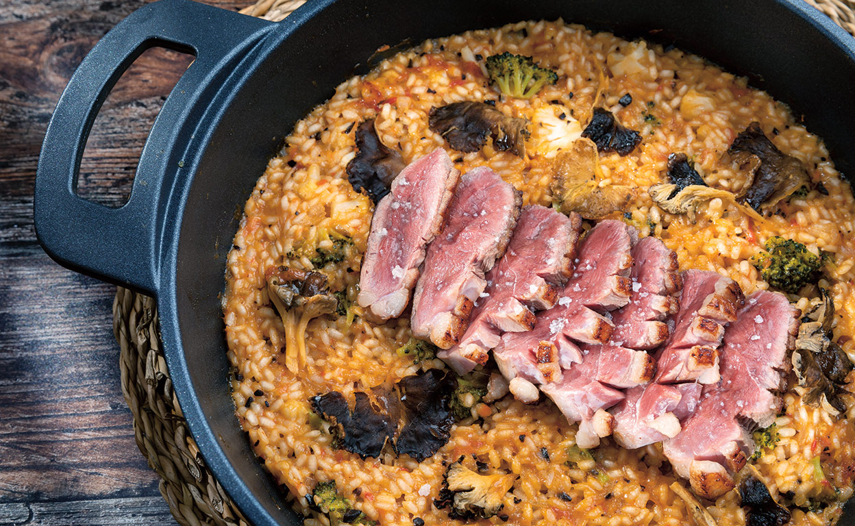 Cuadricula la parte grasa del magret con un cuchillo, sin llegar a la carne. Salpimiéntalo, arrima una sartén a fuego muy suave y apoya la pechuga sobre la grasa, para que vaya cocinándose y derritiéndose. Ve retirando el exceso de grasa del fondo hasta que quede una capa tostada y de un grosor de 5 milímetros. Da la vuelta a la pechuga y cocínala 1 minuto por el lado de la carne. Deja que repose unos minutos antes de rebanarla, colocando los escalopes sobre el arroz.
