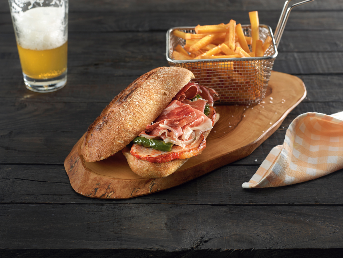4- Mezclamos en un bol el tomate con una pizca de aceite de oliva y sal. Pringamos el tomate en el bollo de pan partido en dos, completando con los lomos recién fritos, los pimientos y las lonchas de jamón. Cerramos el bollo, apretando bien para que se empape lo suficiente y listo.