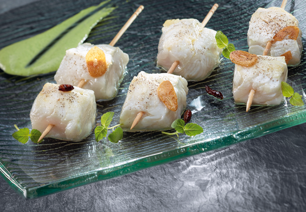De la merluza. se limpia la merluza y se corta en dados de 3 x 3 cm. Se ensartan dos trozos de pescado en cada palillo chino. Se ponen las brochetas en una placa de horno y, en el momento de servir, se sazonan y meten al horno a 240 grados durante 90 segundos. Se sacan y se les echa por encima un refrito hecho con el aceite, el ajo y la cayena, recogiendo los jugos de la placa de horno y repitiendo la operación dos veces.