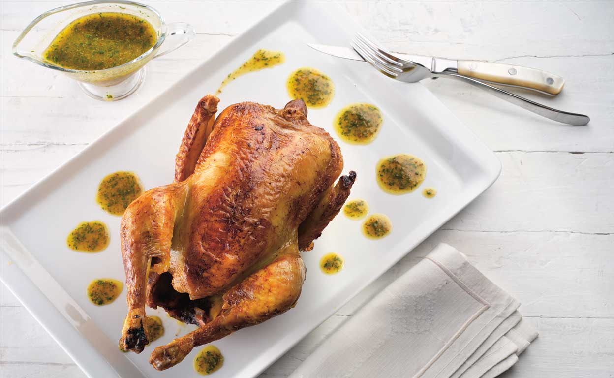 Acabado: cubre el pollo con papel de aluminio y déjalo reposar de 5 a 10 minutos antes de trincharlo, para que los jugos se concentren en su interior y quede mucho más tierno. Recupera el jugo colándolo a un cazo y retira con una cuchara el exceso de grasa que se acumula en la superficie. Hiérvelo, añade la mostaza, el zumo de limón y el perejil y prueba el sazonamiento, que debe quedar desligado, ligero y de profundo sabor.