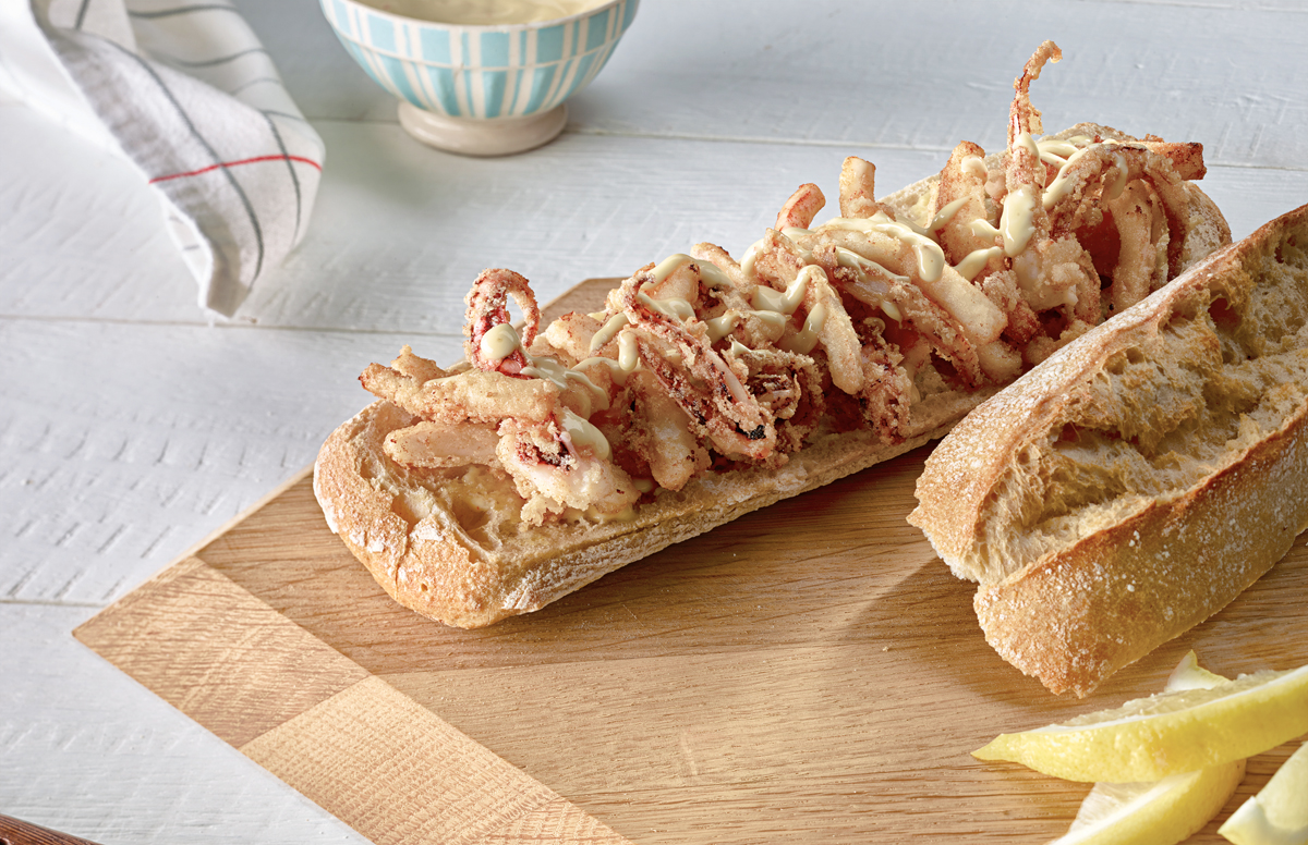 4. Acabado y presentación: escurrimos los calamares y los secamos. Enharinamos los calamares y los freímos en aceite muy caliente. Los escurrimos sobre papel absorbente. Abrimos los bollos y los rellenamos de calamares y mahonesa.