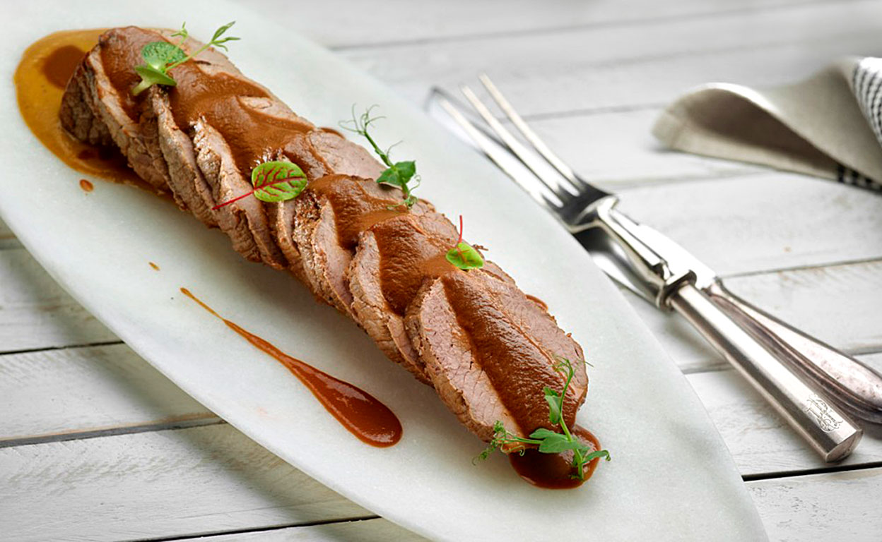 Acabado: pasados, escurrimos la carne y la pinchamos para saber si está tierna. Si aún ofreciera resistencia, la guisamos un rato más. Mientras, trituramos la salsa pasándola por un colador fino para que quede aterciopelada. Troceamos la carne en finas lonchas y la sumergimos en la salsa rectificada de sazonamiento. Le damos un hervor final de unos 10 minutos para que se asiente y ¡listo!