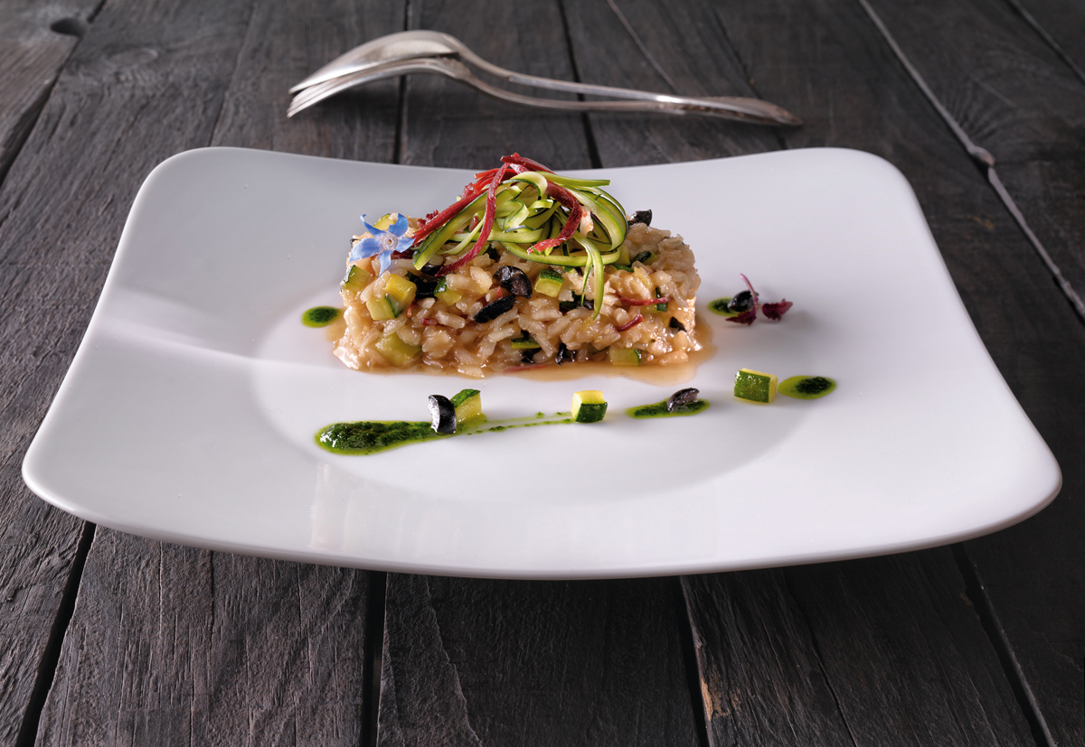 3. Acabado y presentación: se incorpora de a poco el caldo, sin dejar de mover durante 17 minutos hasta obtener el punto deseado del arroz. Aparte, se saltean los dados de pieles de calabacín. Se reservan.