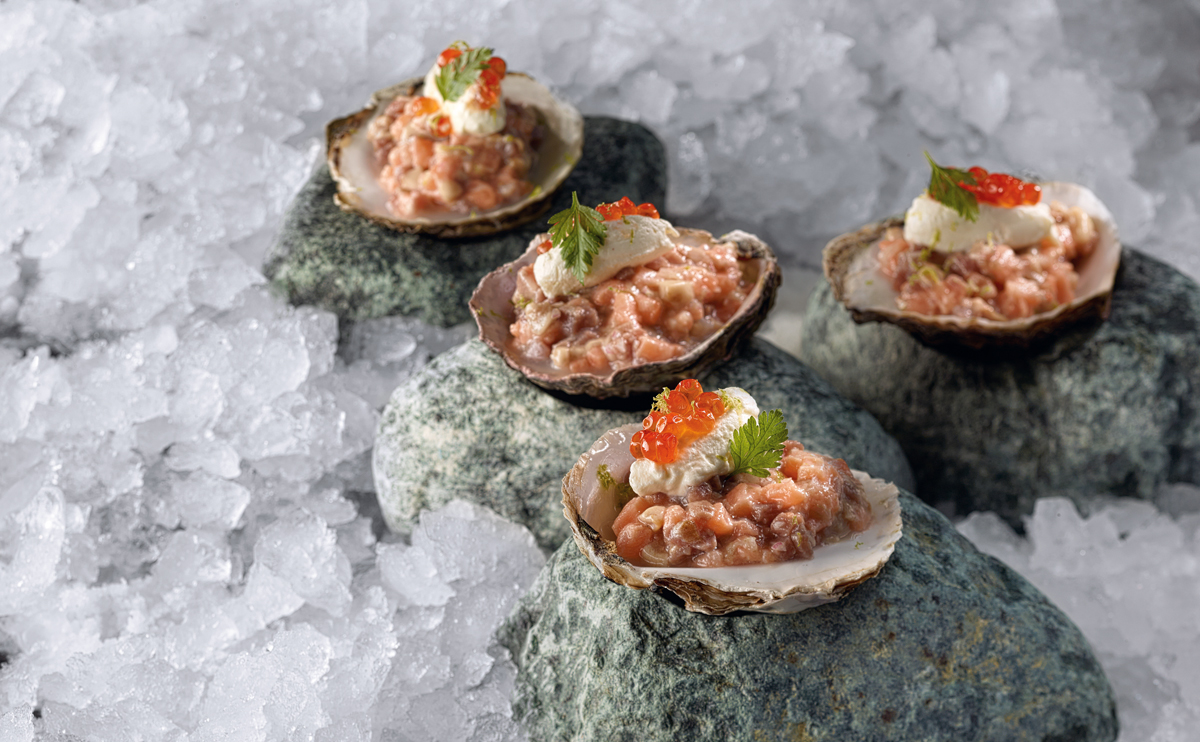 Se coloca el tartar sobre la concha de la ostra y se coloca por encima una cucharillade café de crema chantillí y las huevas de truchas. ¡Y listo! Ya tienes la receta de tartar de ostras, atún y salmón terminada.