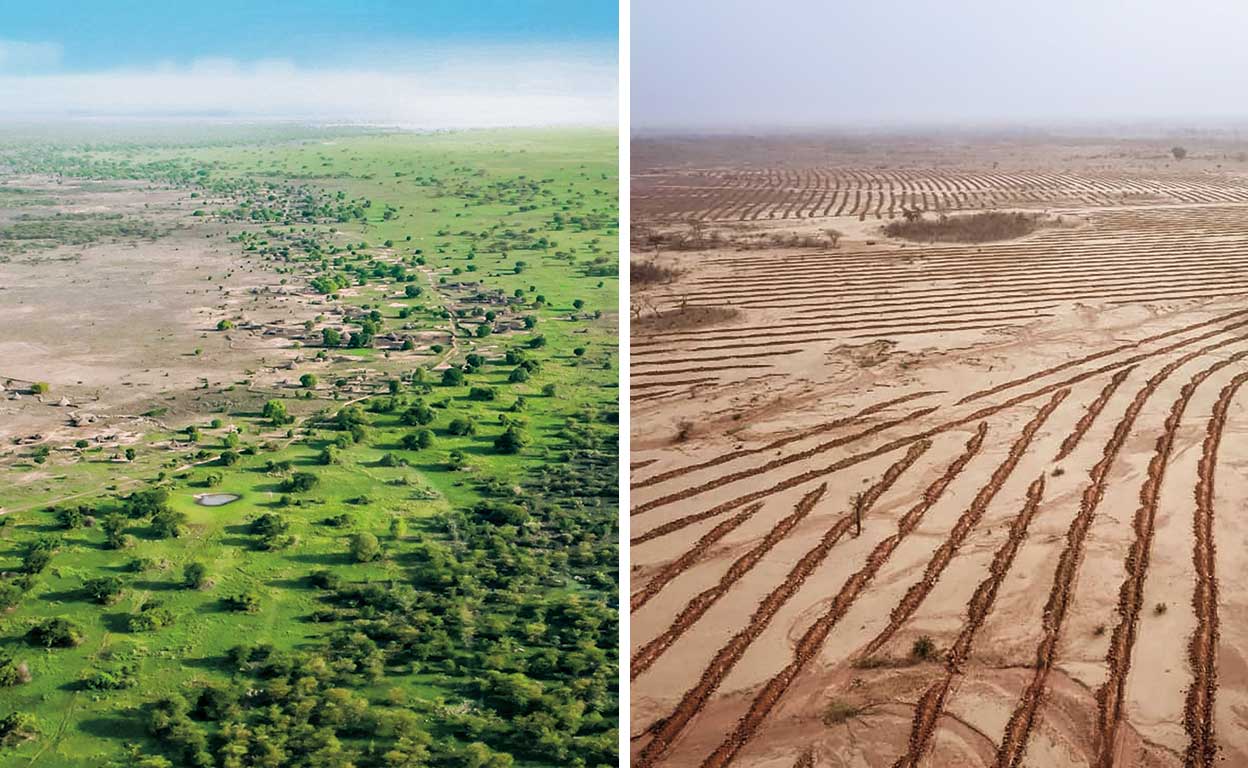 La Gran Muralla Verde africana (izda.) es un proyecto colosal: un cinturón verde que atraviesa el continente de oeste a este formado por una línea de bosques de 15 kilómetros de ancho y 8000 de longitud. Once países han acordado levantar esta barrera vegetal para frenar el avance del desierto. Dcha.: Plantación de árboles jóvenes en la región de Turkana (en Kenia), una zona azotada por terribles sequías. Fotos: Convención de las Naciones Unidas de Lucha contra la Desertificación / Ecosia