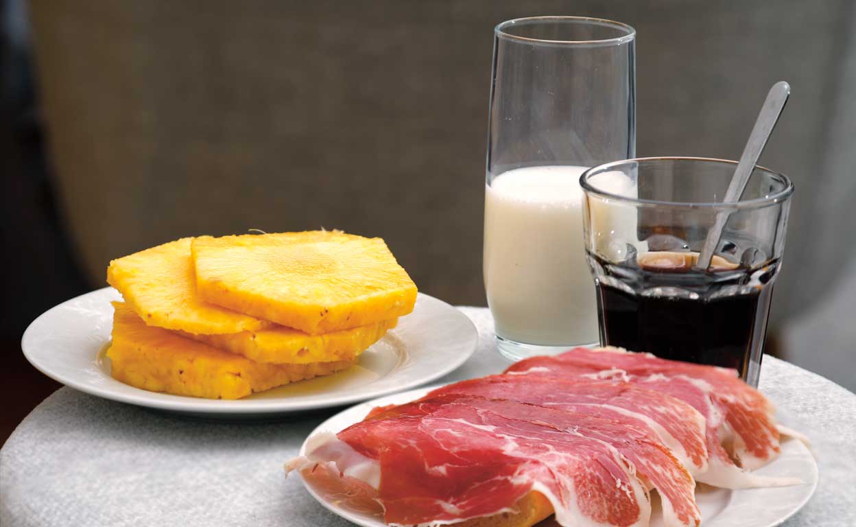 «Una rodaja de piña, un platito de jamón ibérico de bellota, una tostada con aceite de oliva virgen y un café con leche».
