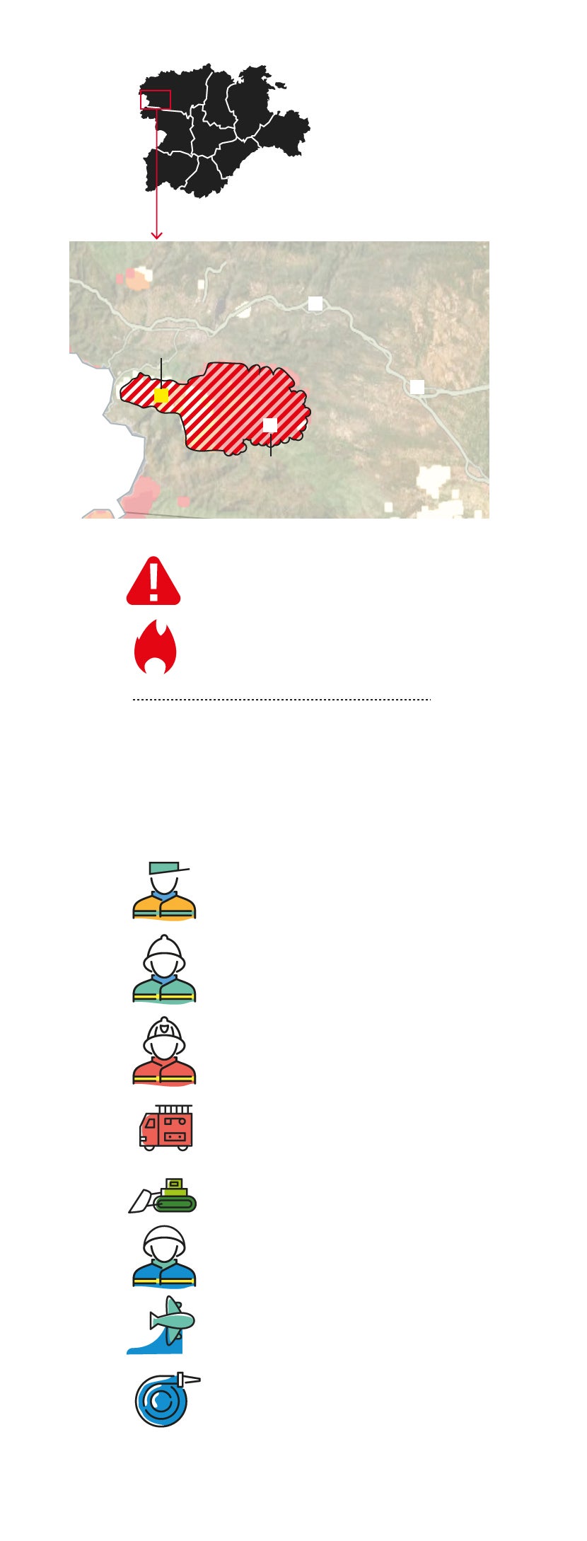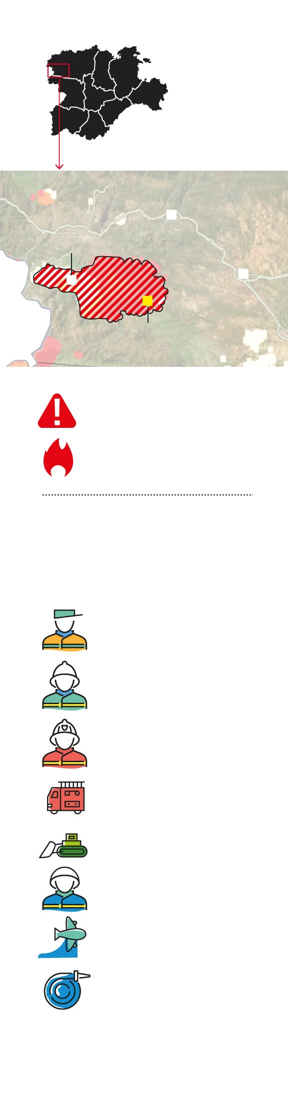 La atención en Zamora estaba entonces en el fuego que desde Orense avanzaba hacia los valles de Pías y Hermisende, ya que el frente del fuego, de 20 kilómetros, «es muy agresivo y viene descontrolado». De momento, ya se han desalojado 1.718 residentes de cinco municipios del valle de Porto y Pías, además de la localidad de Castromil, muchos de ellos acogidos en el albergue de Puebla. En estos incendios de Zamora, así como en los de León, hay desplegados 420 efectivos de la UME, además de 2.200 personas de apoyo.